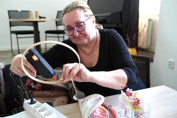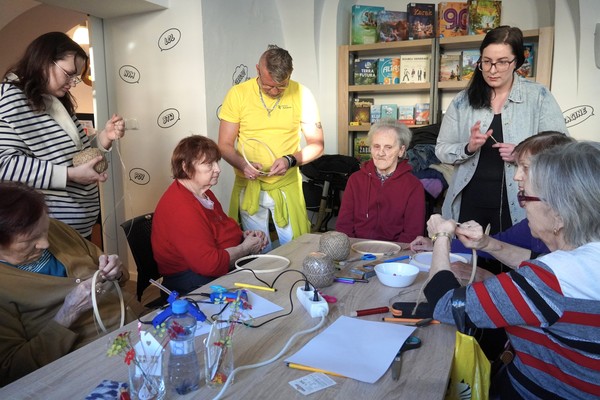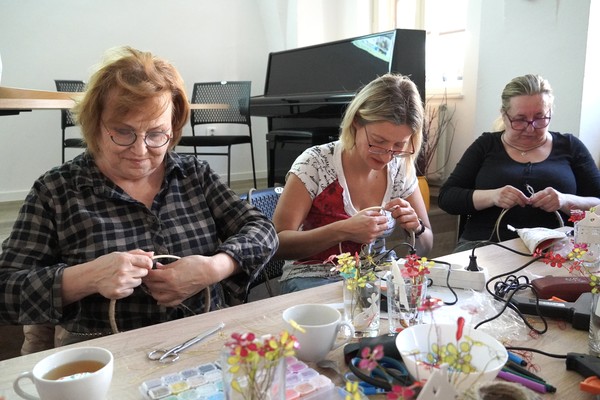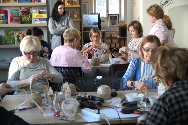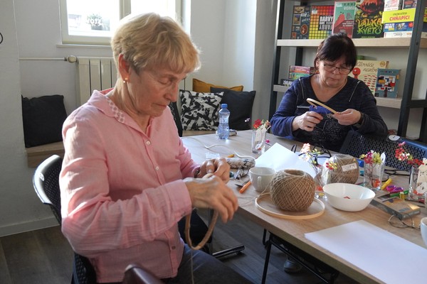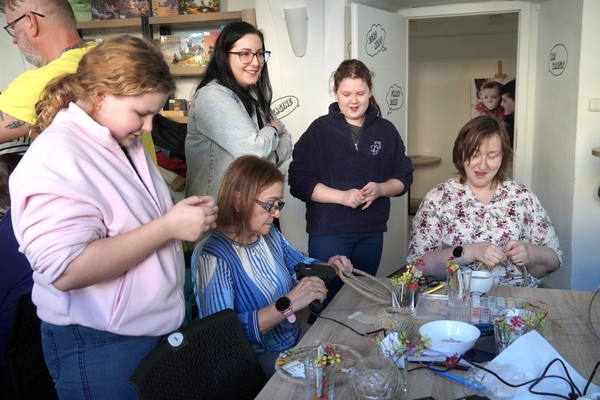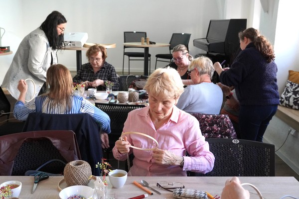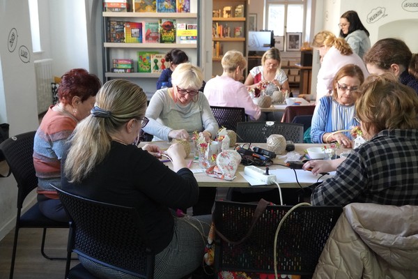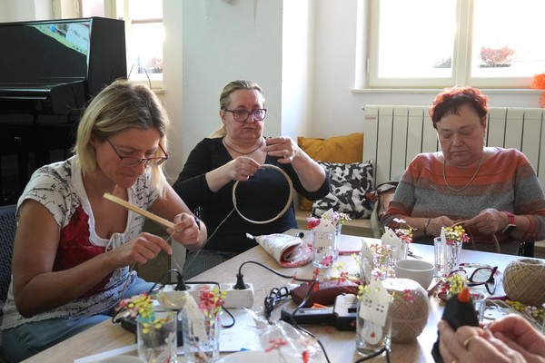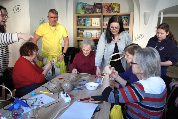 U jednoho ze stolů se sešly příznivkyně tvoření, které si tuto aktivitu nenechávají ujít každý měsíc. Nad dobrou kávou nebo čajem, mezi lehkým povídáním, se daly do práce a proměnily materiály v jemně propracované dekorace. „Chodím sem pravidelně každý měsíc a vždy se těším. Knihovnice jsou šikovné a pokaždé připraví něco nového. Jarní věnec mě oslovil hlavně díky drátkování a trošku makramé. Je to puntičkářská práce, při které se člověk soustředí na každý detail a zároveň si vyčistí hlavu od starostí. Navíc je tu vlídné prostředí se spoustou příjemných lidí,“ uvedla návštěvnice Helena Kolibová. Výrobu jarního věnce pro radost si přišli vyzkoušet také klienti Domova Alzheimer Darkov.