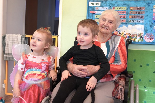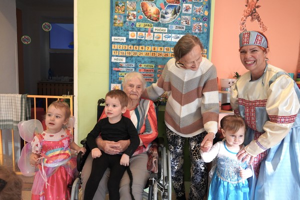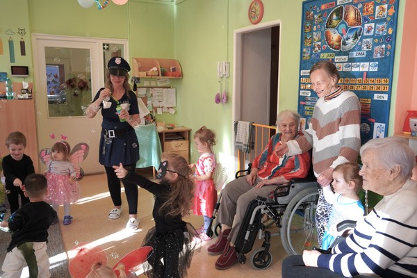 Diskotéka s dětskými písničkami vytvořila přirozený prostor pro společné chvíle – děti tančily v kostýmech, senioři je povzbuzovali, zapojovali se do pohybu a sdíleli s nimi radost z karnevalové atmosféry. Právě podobná setkání umožňují přirozený kontakt mezi generacemi a obohacují běžný program obou skupin.